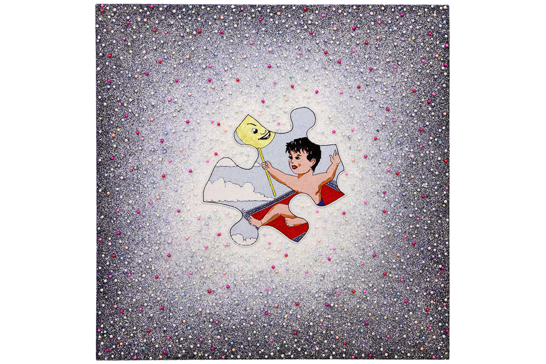 Farhad Moshiri follow Captive 2014 Acrylic and beads on canvas on board 59 116 x 118 18 inches 150 x 300 cm - Two Panels of 150 x 150 cm each. But the 40-year-old Iranians work has consistently and subtly played with topics Iranians rarely treat with irreverence. Courtesy the artist and The Third Line.